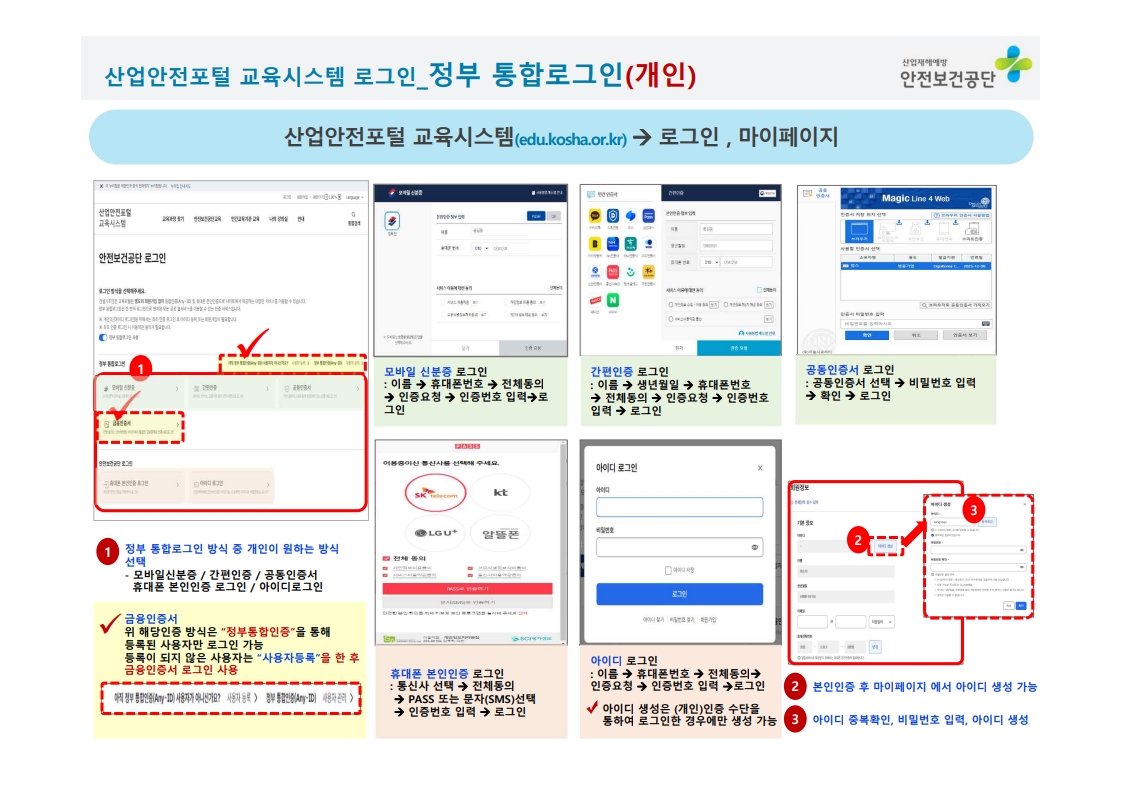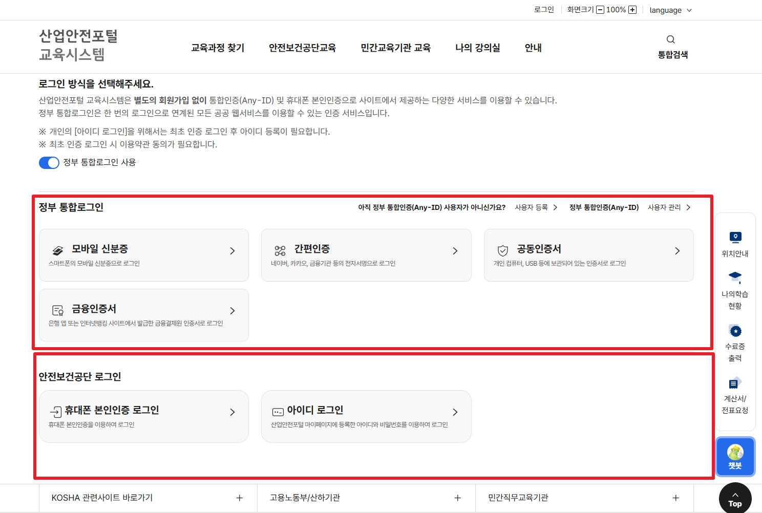 2. 정부 통합로그인 또는 안전보건공단 로그인 중 선택하여 로그인합니다.