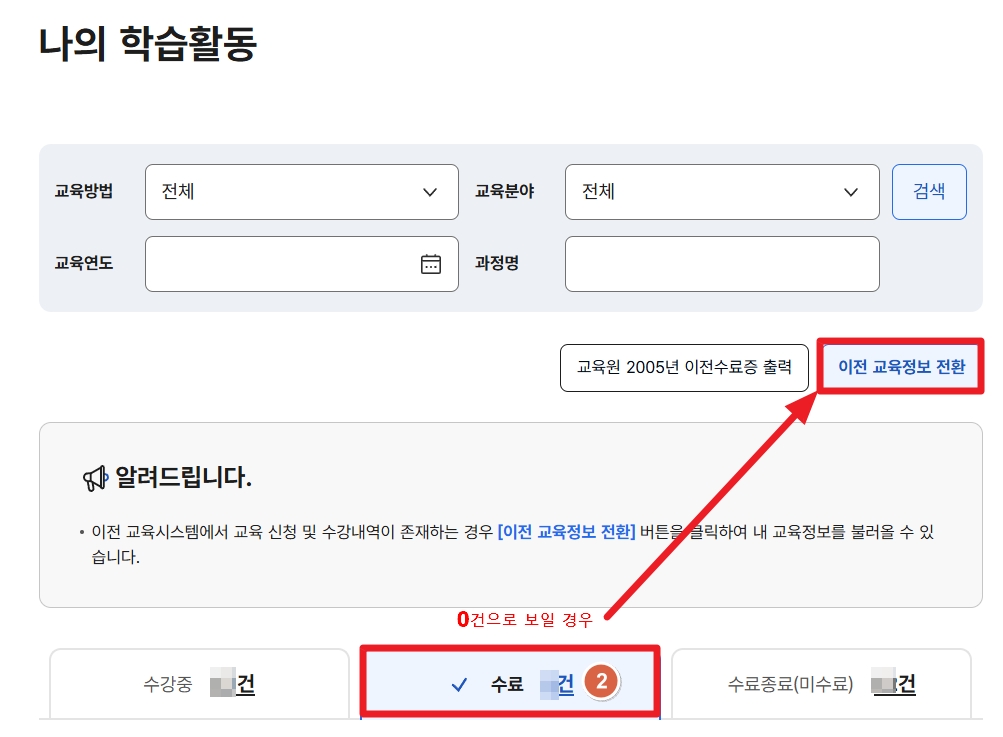 [교육기관] [교육기간] [교육대상]을 체크 후 검색 클릭 (↓이미지 아래 설명확인)