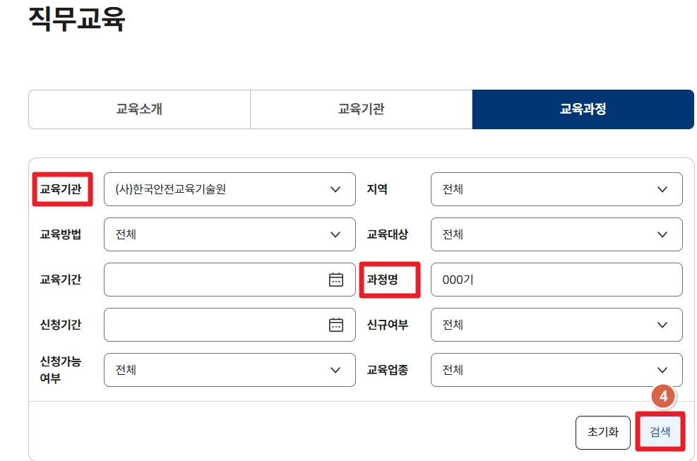 [교육기관] [과정명(교육기수)]을/를 입력하여 검색(↓이미지 아래 설명확인)