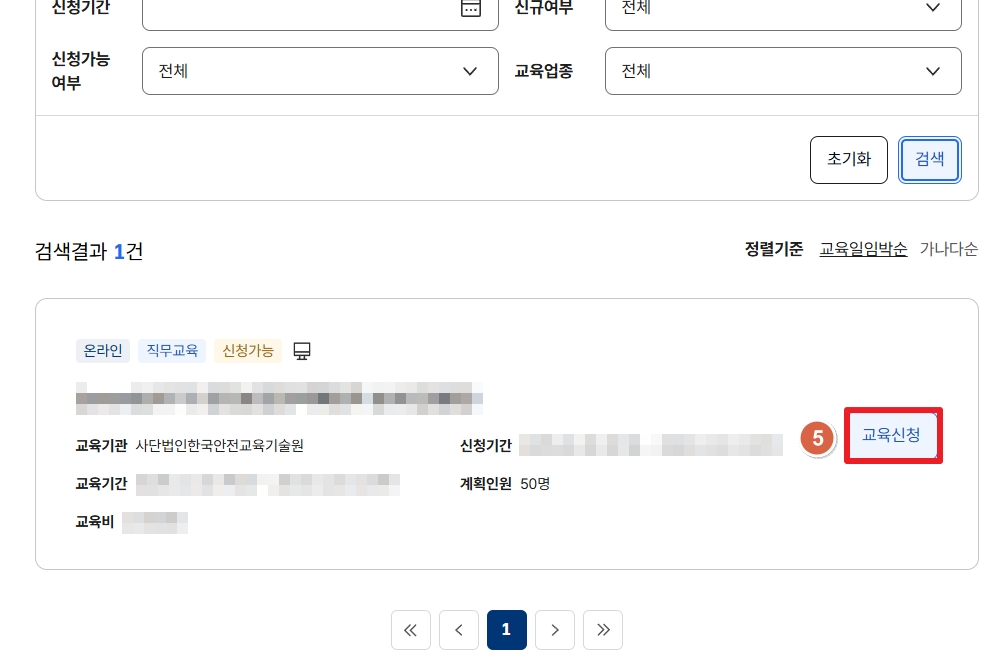 6. 검색시 아래에 교육과정이 검색되면 [교육신청] 클릭 > [교육신청] 한 번 더 클릭
