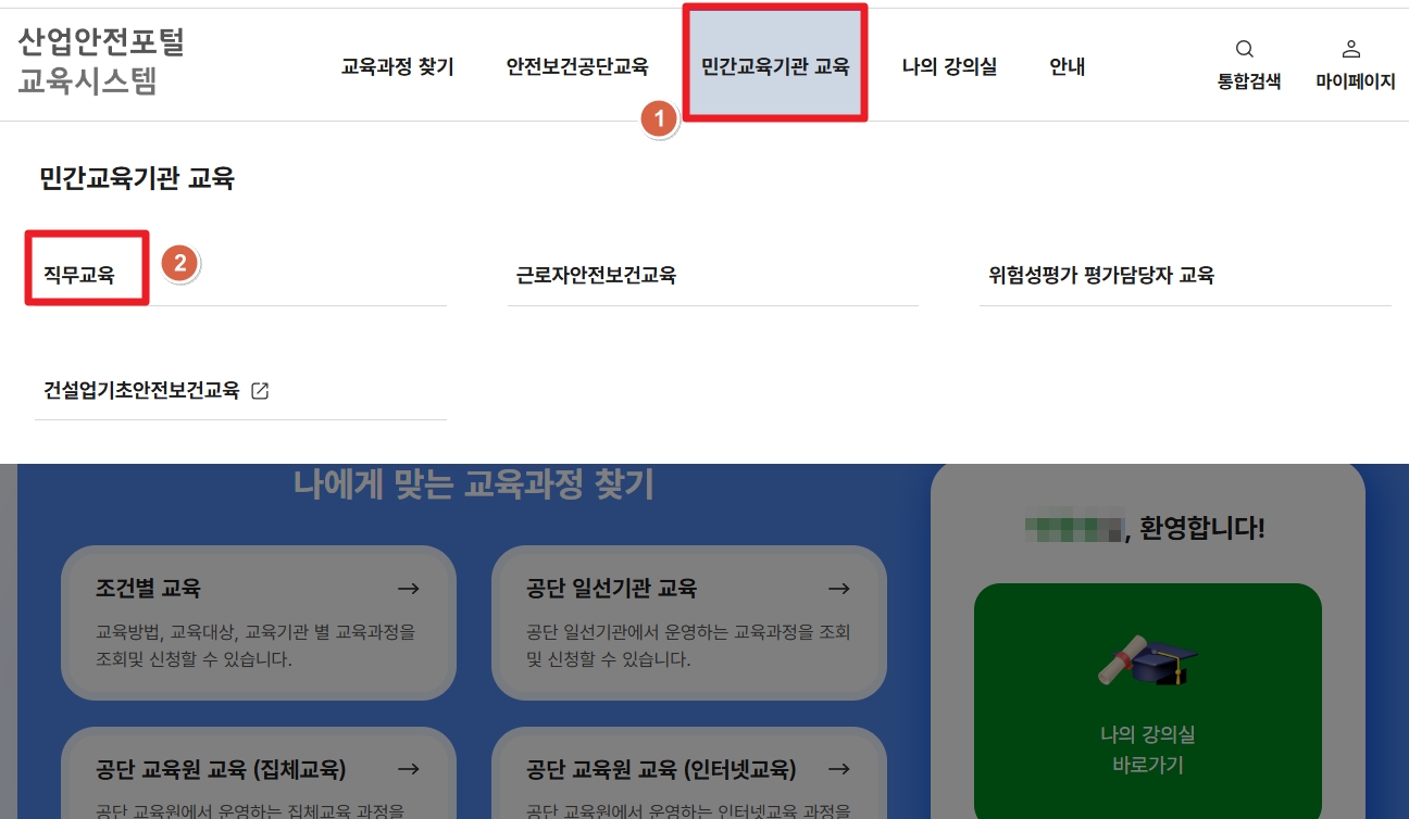 3. 상단 메뉴의 [민간교육기관 교육] [직무교육]을 차례로 클릭합니다.
